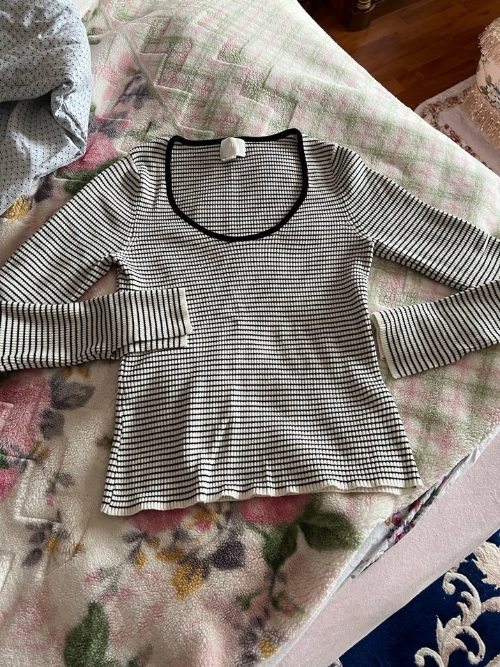 Uzun kollu, tekne yaka, çizgili örme pamuk kumaştan yapılmış, dar kesim gri bluz. Trendy sokak giyimi için uygundur.