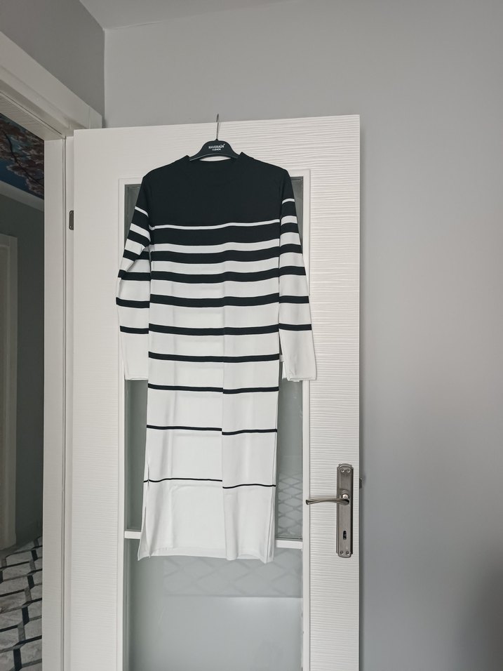 Gri ve beyaz çizgili, uzun kollu, bisiklet yaka triko elbise. Yanında yırtmaç bulunur. Sentetik kumaştan, sade ve rahat günlük kullanım için uygundur.