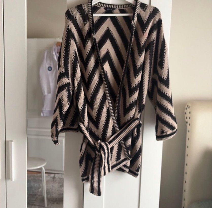 uzun kollu, V yakalı, midi boy, triko dokuma, çizgili, bol kesim kadın hırka. nisan marka. M-L beden