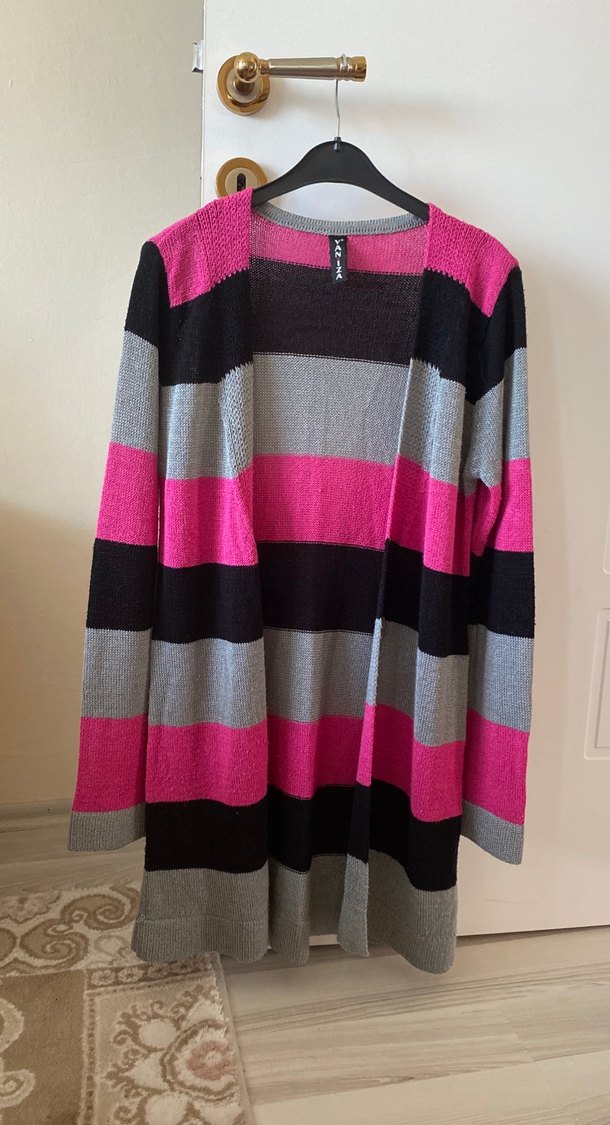 Uzun kollu ve kayık yaka çizgili triko hırka, bol kesim ve pembe, gri, siyah renklerde rahat bir günlük stil sunar.ön 2 koltuk arası 44 cm uzunluğu 78 cm