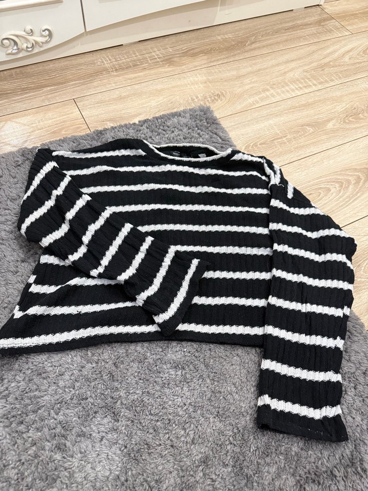 Bu kadın kazağı, çizgili deseni, uzun kolları ve tekne yaka ile dikkat çeker. Yumuşak triko kumaştan üretilmiş, bol kesim ve midi boyda, rahat sokak stiline uygundur.