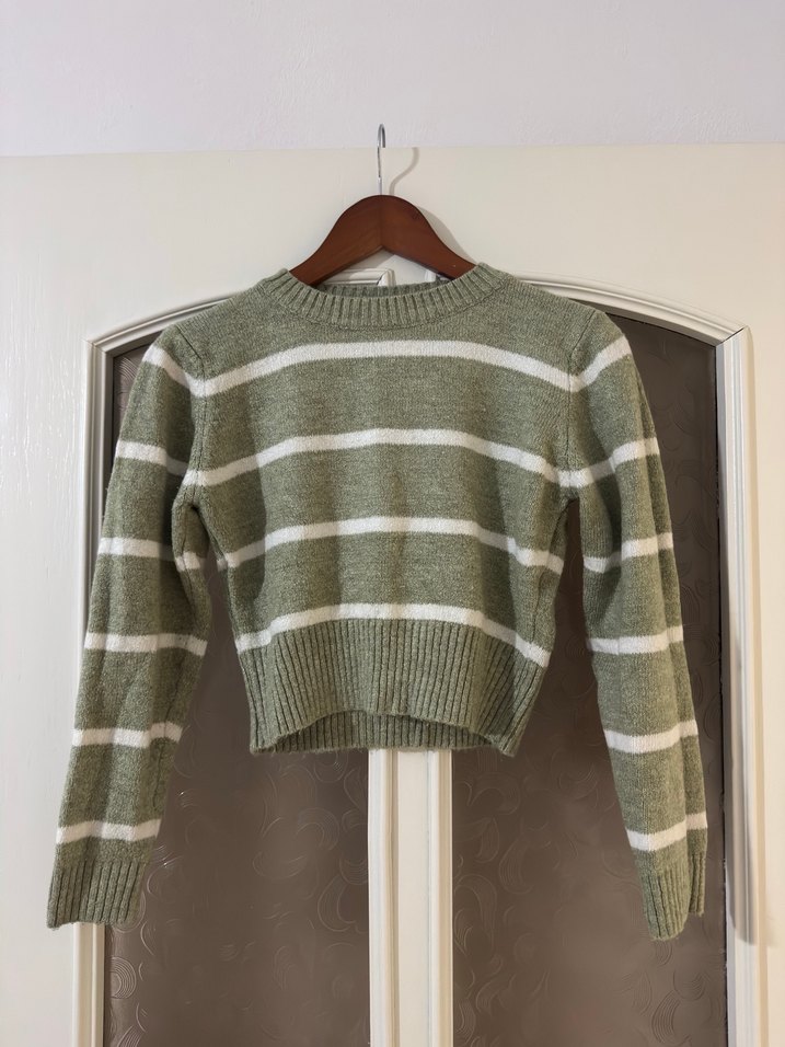 ✨ Şık yeşil-beyaz çizgili crop triko kazak ✨ 36 bedene daha uygun ✨ Etek ve pantolon kombinleri için ideal ✨ Temiz ve deformesiz