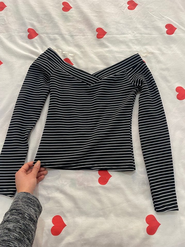 Çizgili desenli, düğmeli, uzun kollu, v yaka, dar kesim bluz. Yumuşak sentetik kumaştan, günlük rahat sokak stili için uygun.