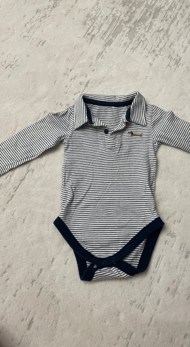 Gri renkli, uzun kollu bebek body, yaka ve düğme detaylıdır. Pamuklu kumaştan üretilmiş, çizgili desene sahiptir ve kolay giydirme için çıtçıtlıdır.