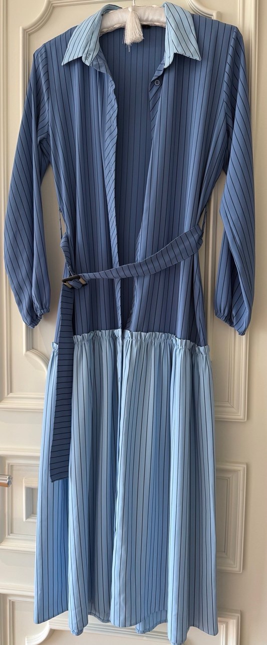 Çizgili desenli, pilili sentetik kumaştan uzun mavi elbise. Notlu yaka ve kemer detayına sahip. 40 beden rahatlıkla olur ilgilenenlerle en boy bilgisi paylaşabilirim.