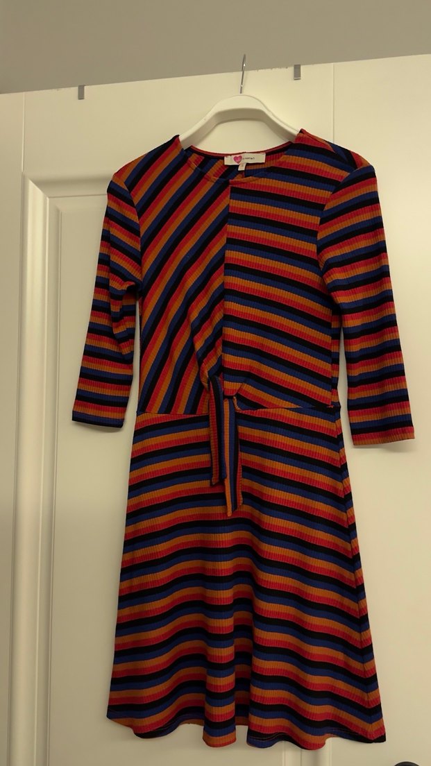 Koyu renkli çok renkli çizgilerle, tekne yakalı, bele bağlamalı, üç çeyrek kollu, bohem ve retro tarzda dar kesim triko elbise.