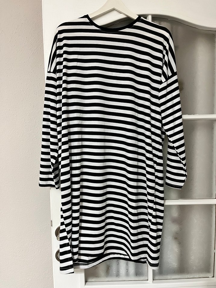 Pamuk kumaştan, uzun kollu ve kayık yaka, bol kesim çizgili uzun tunik. Aldım fakat hiç giymedim bol kesimdir .