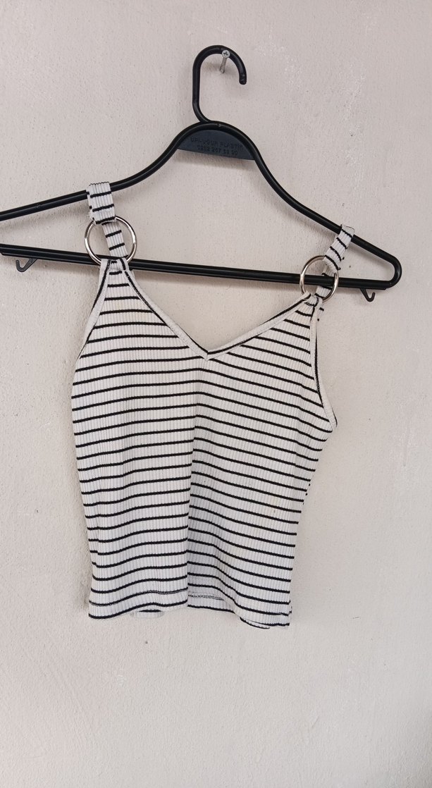 V yaka, çizgili ve askılarında tokalı, kısa kesim sıkı oturan atlet. Yumuşak sentetik kumaştan, gündelik ve sokak tarzı için uygundur. ⚡m l bedene uyumlu