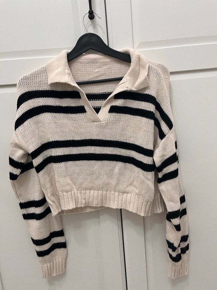 Bej renkli bu triko kazak, uzun kollu, V yaka ve çizgili desene sahiptir. Rahat kesimi ve normal boyu ile günlük sokak stiline uygundur.