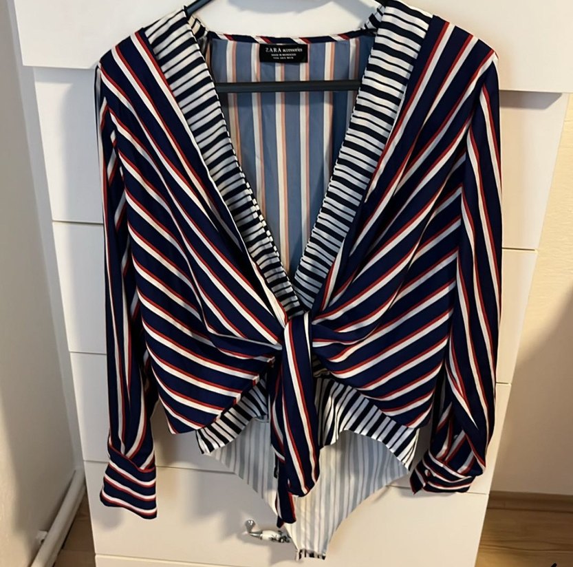 V-yaka, drapeli ve çizgili desenli, normal boyda, fit kesim kadın bluz. Ofis kullanımı için uygun, çok renkli ve koyu tonlarda.