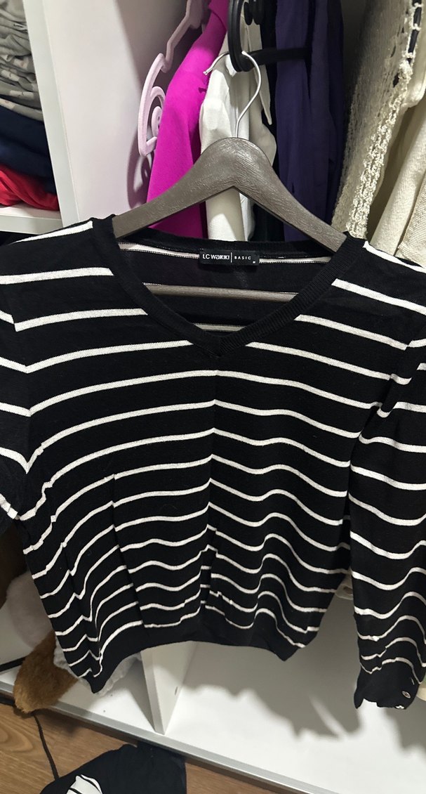 Siyah-beyaz çizgili, V yaka, pamuklu ve örme kumaştan yapılmış, uzun kollu, normal boyda, rahat kesim kadın kazak.