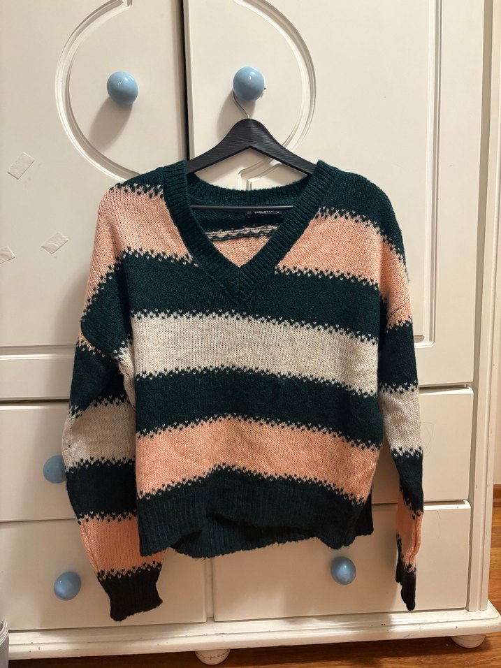 Uzun kollu, V yakalı, bol kesim kadın triko kazak. Koyu renkli, çok renkli çizgili örgü kumaştan yapılmıştır. Rahat sokak stili için uygundur.