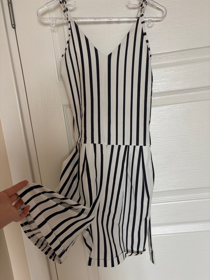 V yaka, pilili detaylı, beyaz üzerine koyu çizgili sentetik kumaştan, askılı ve midi boy, dar kesim kadın tulum. Yeni bir kez giydim.