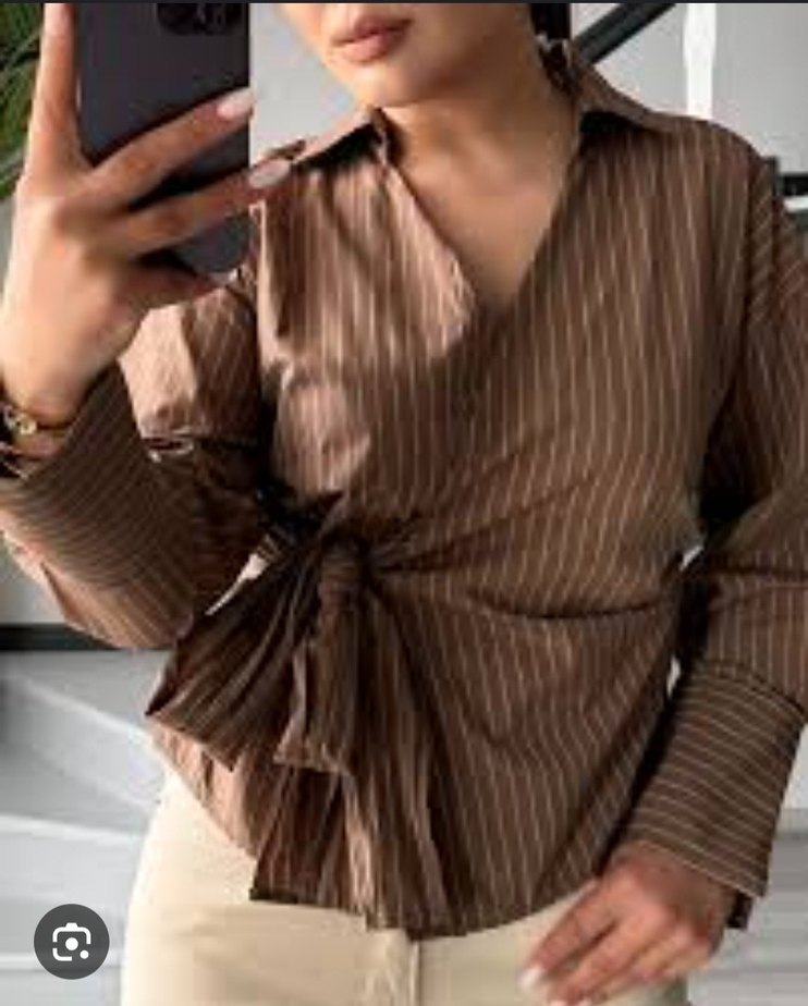 Kahverengi uzun kollu, V yakalı cizgili gömlek. Düğmeli ve yan bağcıklı, normal kesim, ofis için uygun. 1 saat giydim cok şik bi urun kilo aldim icin olmuyo su anda 690 tl almistim