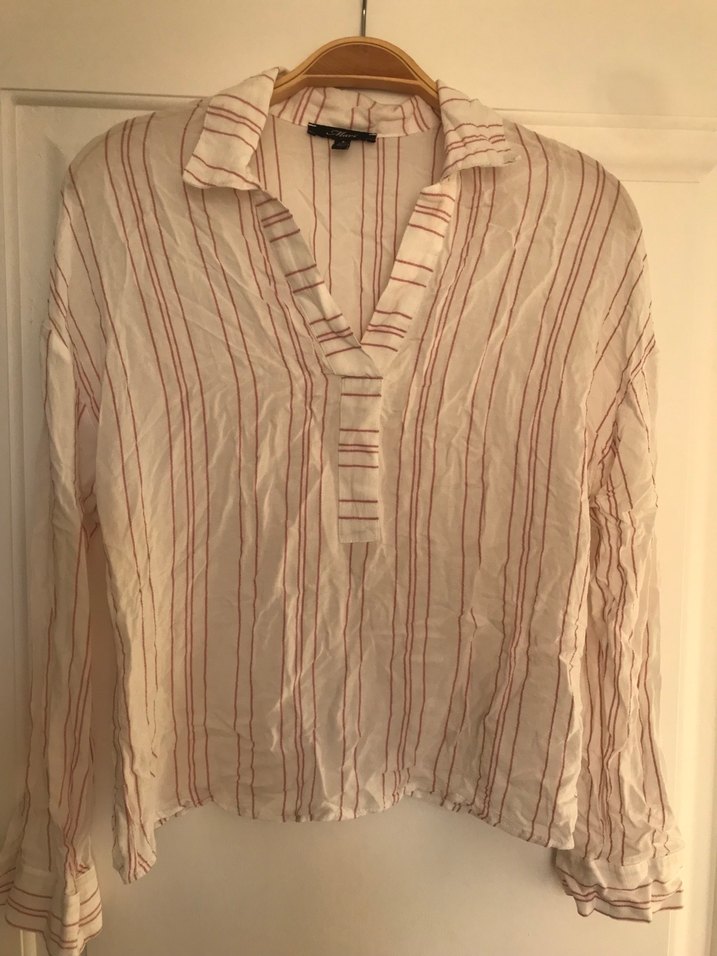 Renkli keten gömlek, uzun kollu ve V yaka tasarıma sahiptir. Çizgili deseni ve düğme detaylarıyla bohem tarzını yansıtır.