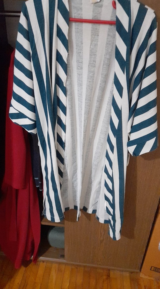 Gri ve beyaz çizgili, V yaka, kısa kollu, midi boy, bol kesim hemşire sabahlığıdır. Rahat kullanım sunar.
