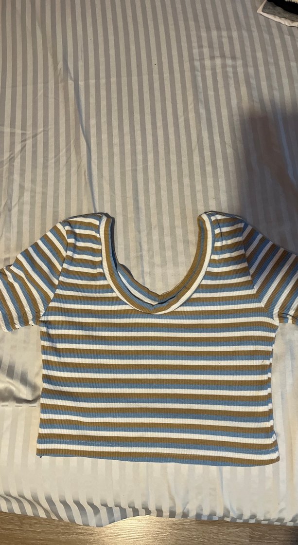 Dar kesim, tekne yaka ve kısa kollu kadın bluz. Bej ve beyaz çizgili, yumuşak sentetik kumaştan, rahat sokak stili için uygun.
