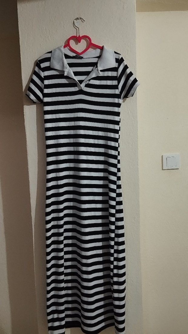 Uzun ve dar kesim kadın elbisesi, kısa kollu ve V yaka tasarıma sahiptir. Sentetik kumaştan üretilmiş, çizgili desene ve pileli detaylara sahiptir. Gri tonlarında, günlük sokak stiline uygundur.