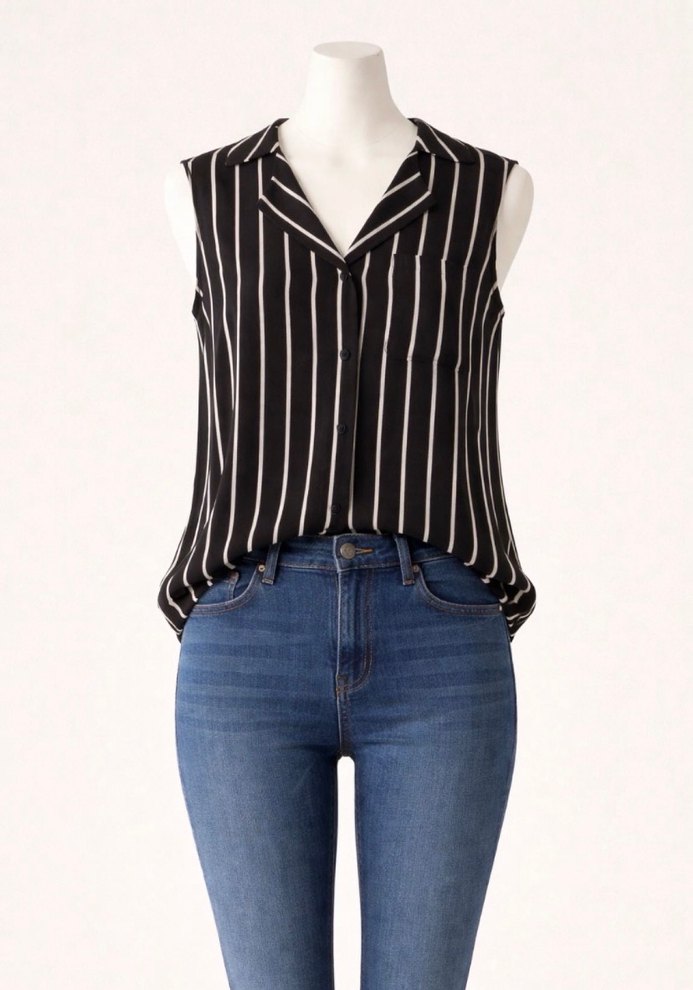 Çizgili V Yaka Kolsuz Kadın Gömlek