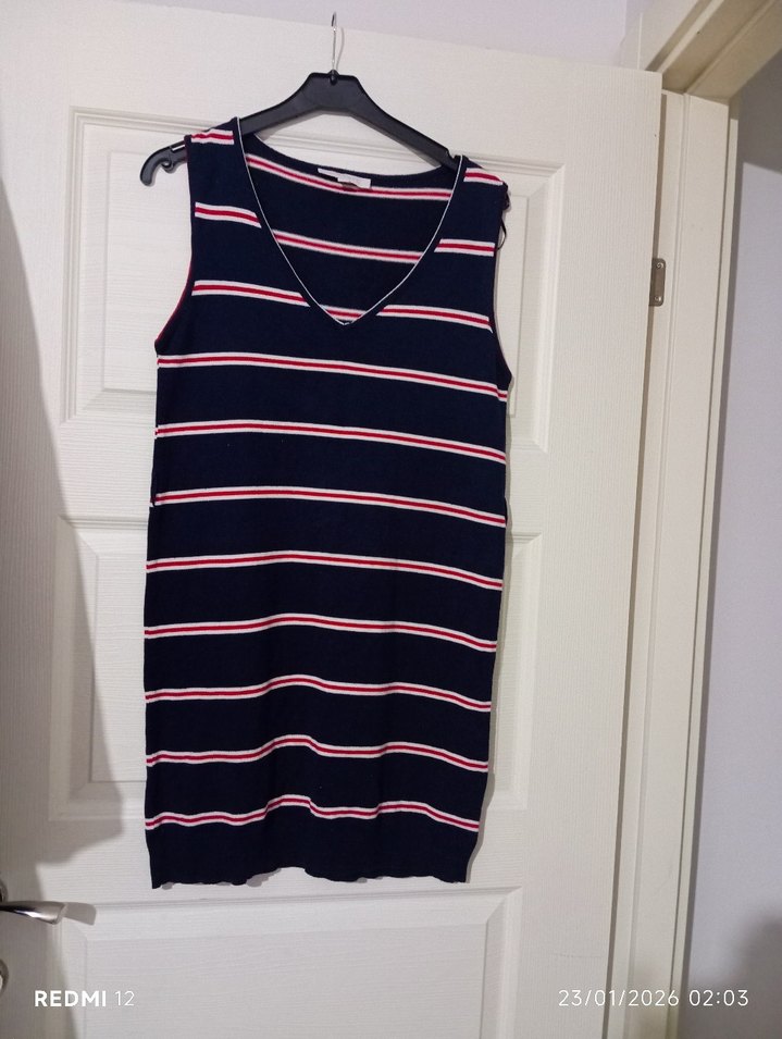 Kolsuz, v yaka, çizgili ve triko dokulu midi boy elbise. Rahat sentetik kumaştan, günlük sokak stili için uygun.