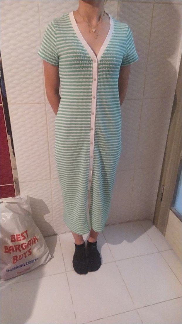 V yaka ve kısa kollu, çizgili ve pileli detaylı, yumuşak sentetik kumaştan yapılmış, vücuda oturan midi elbise. Günlük sokak stili için uygundur.