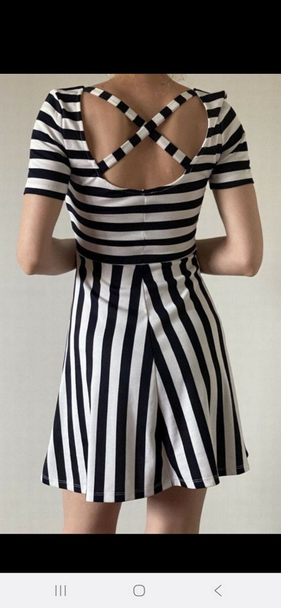 V yaka, sırtı çapraz askılı, pileli etekli siyah beyaz çizgili midi elbise. Pürüzsüz sentetik kumaştan, gotik ve Paris tarzını yansıtır. Günlük kullanıma uygun.
