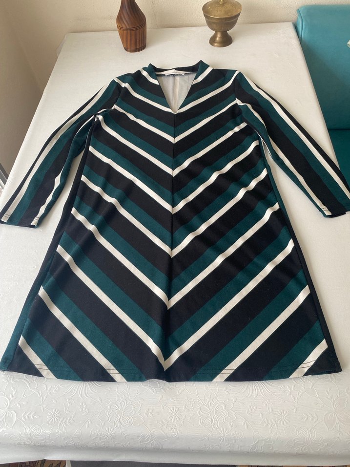 Kadınlar için V yaka, uzun kollu, bol kesim triko elbise. Pilili ve çizgili desenli, koyu çok renkli, günlük kullanıma uygun. Ölçüler ve bilgileri resimlerde mevcuttur