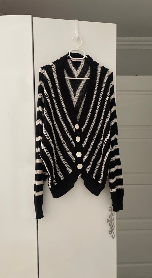 Siyah-beyaz çizgili, V yaka ve uzun kollu örgü kadın kazak, bol kesimiyle gotik tarzda günlük kullanım için uygundur.