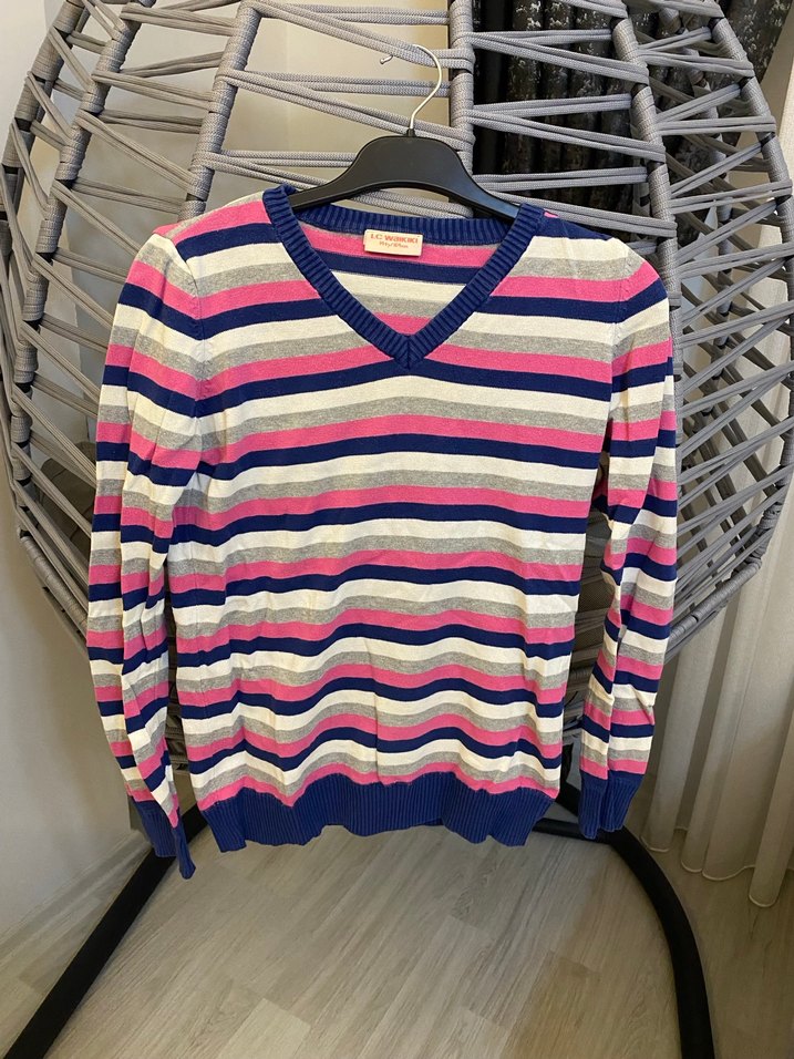 Uzun kollu, V yakalı kadın kazak, bol kesim ve renkli çizgili desene sahiptir. Yumuşak sentetik kumaştan üretilmiş, günlük sokak stiline uygundur.