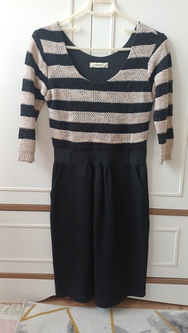 V yaka ve üç çeyrek kollu, çizgili, triko kumaştan yapılmış, bej ve koyu renklerin uyumuyla Paris tarzı günlük giyime uygun dar kesim midi elbise.