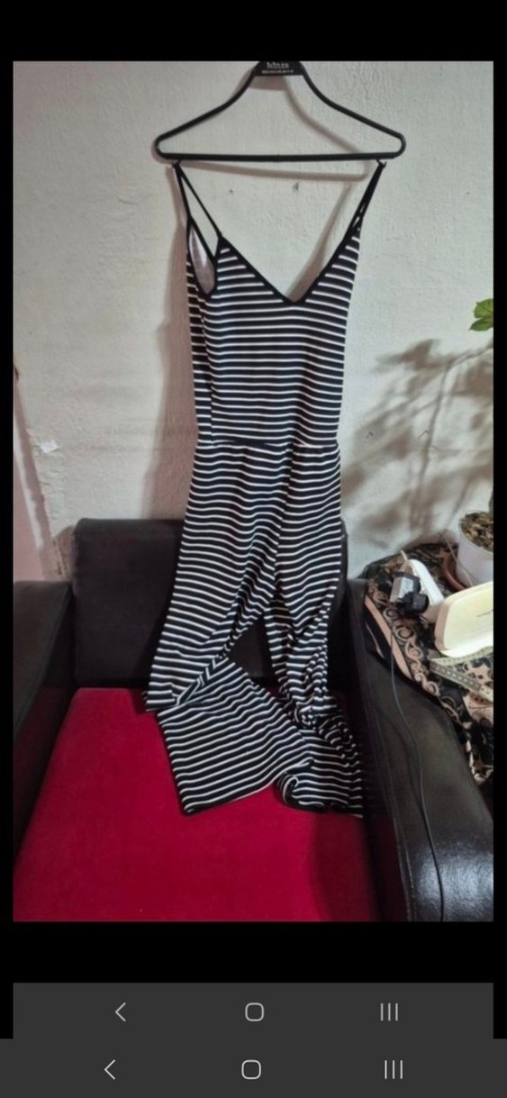 V yaka ve askılı, çizgili desenli, uzun ve vücuda oturan tulum. Yumuşak sentetik kumaştan, şık bir şekilde dökümlü, günlük kullanıma uygun.