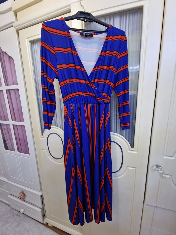 Renkli mavi ve kırmızı çizgili, drapeli uzun hamile elbisesi. V yaka, uzun kollu ve bol kesimle rahat kullanım sağlar. Günlük bohem tarzı için uygun.