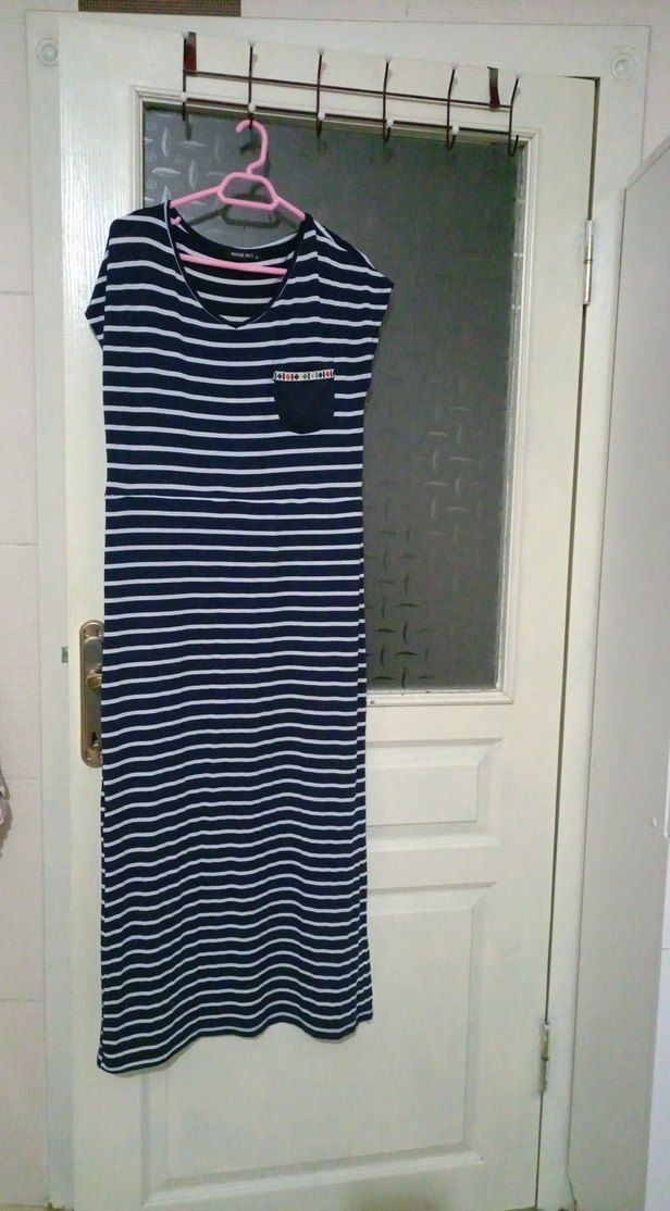 Koyu lacivert çizgili, V yaka, kolsuz uzun elbise. İnce kesimi ve yan yırtmaç detayına sahip, sentetik kumaştan üretilmiştir. Günlük sokak stili için uygundur.