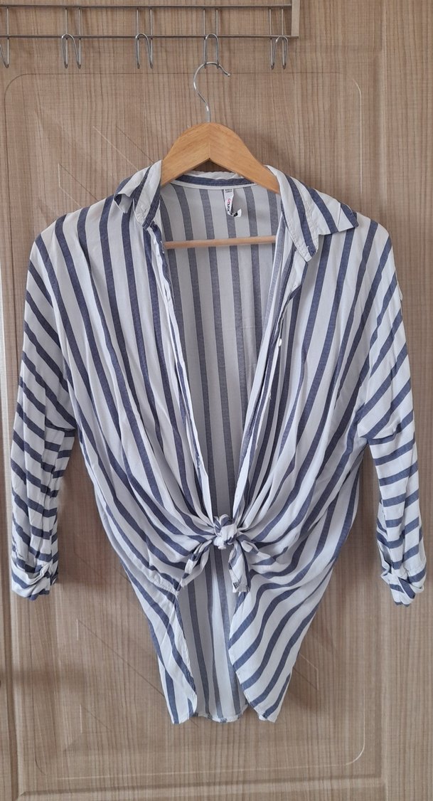 Mavi ve gri çizgili, uzun kollu, V yakalı, bol kesim kadın gömleği. Keten kumaştan, düğmeli ve önü bağlamalı. Günlük sokak tarzı için uygundur.