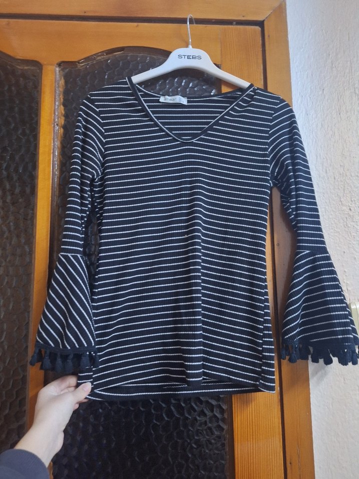 Siyah triko kumaştan, uzun kollu, V yaka ve bol kesim kadın bluz. Pilili, geniş manşetleri ve çizgili deseniyle günlük kullanıma uygundur.