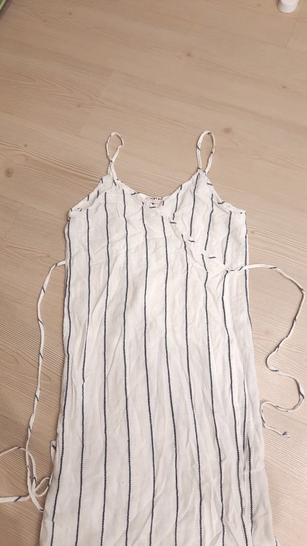 Askılı, V yakalı ve çizgili desenli, bol kesim midi elbise. Beyaz zemin üzerine gri ince çizgilerle rahat ve hafif kumaş.