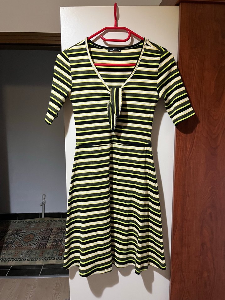 renkli çizgili, V yakalı ve pileli detaylara sahip, yumuşak kumaştan yapılmış likralı ve oldukça rahat bir elbise sadece 1-2 saat kullanıldı.