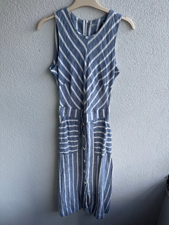 Yumuşak keten kumaştan, kolsuz ve çizgili midi elbise. V yaka ve pile detaylarıyla, günlük kullanıma uygun şık bir model.