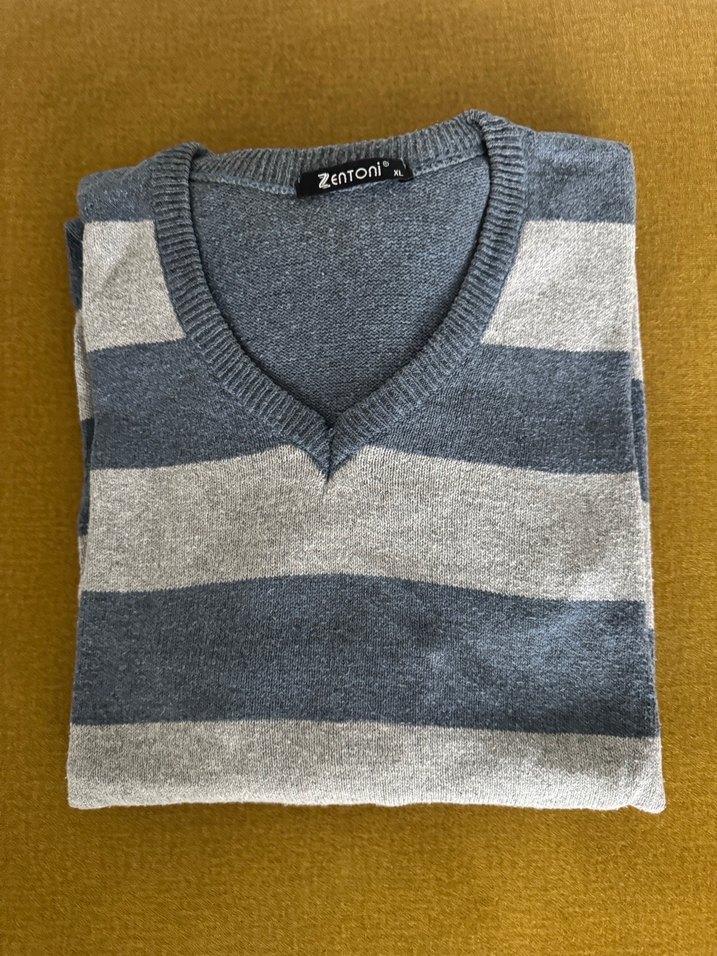 Gri ve Mavi tonlarında çizgili, V yakalı ve uzun kollu erkek kazak. Yumuşak yünden örülmüş, normal kesim ve günlük kullanıma uygun.