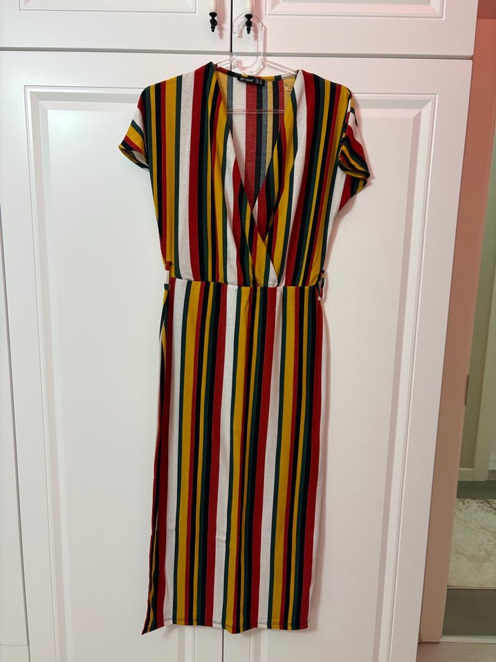 Çizgili desenli, V yakalı ve ince askılı, beli kuşaklı uzun ve dar kesim kadın elbisesi. Sentetik kumaştan, bohem tarzıyla günlük kullanıma uygun.