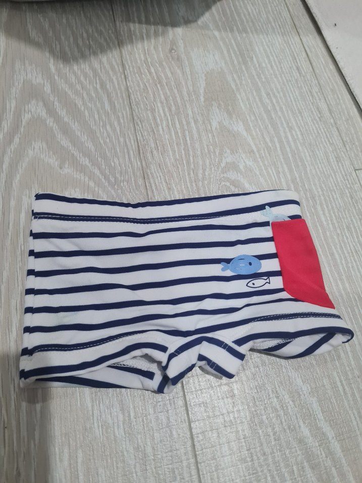 Mavi çizgili, renkli balık desenli, yan kısmı kırmızı detaylı erkek çocuk mayo 1 defa kullanildi sadece