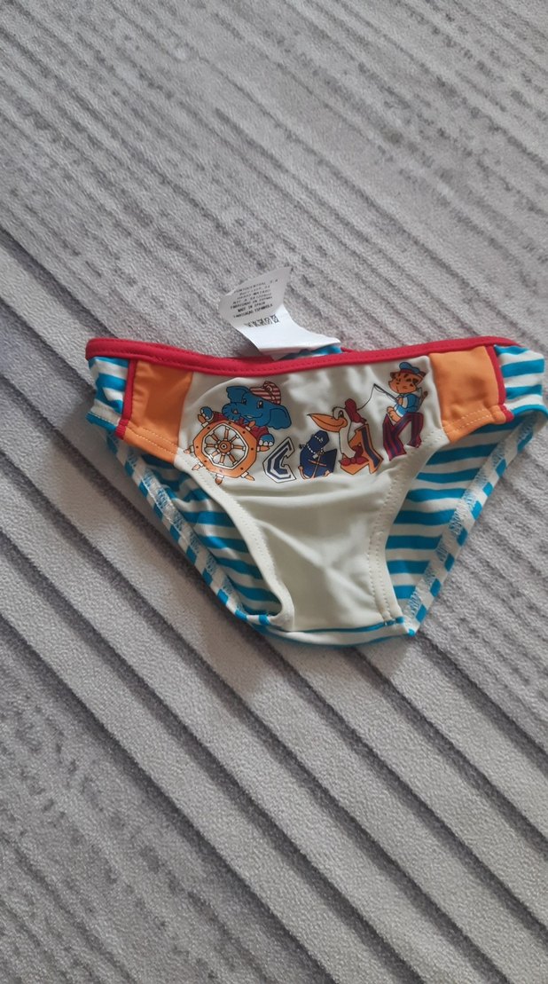 Çizgili yan detayları ve baskılı deniz temalı desenleri olan açık renk erkek çocuk mayo. Canlı renkli ve askılı model. ️ 6 aylık bebek mayo