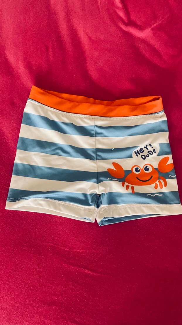 Mavi beyaz çizgili, turuncu beli ve 'Hey, dude!' yazılı sevimli yengeç baskılı renkli erkek çocuk mayo şortu