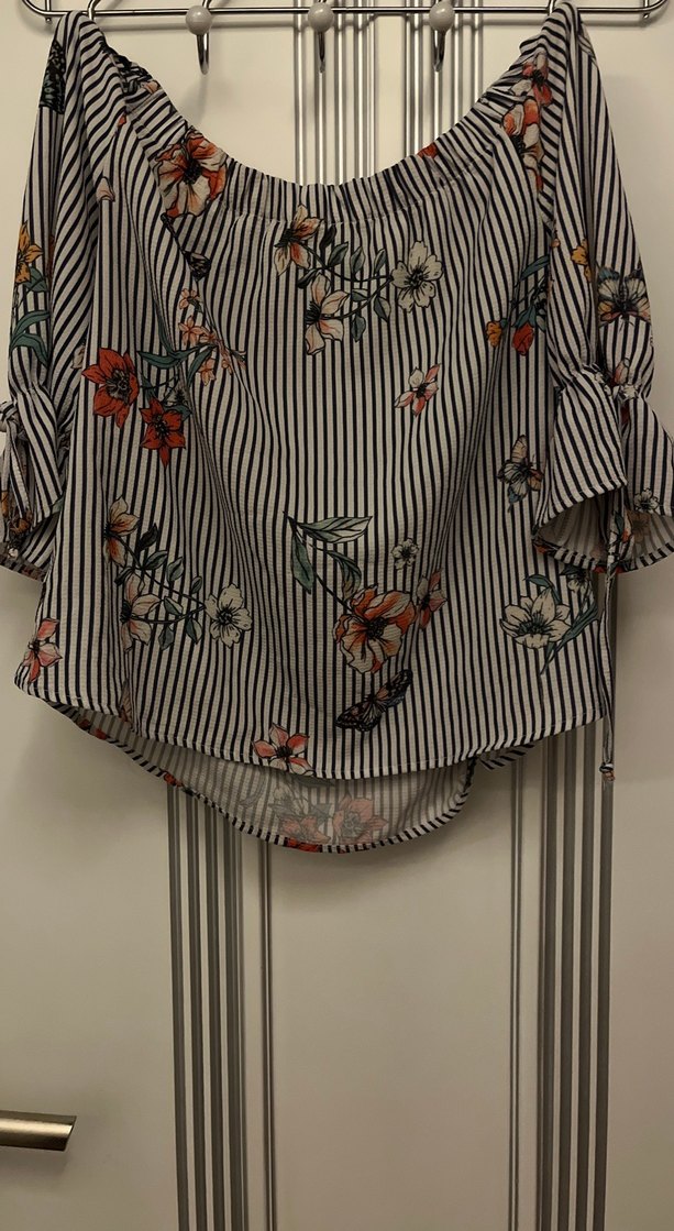 Çizgili ve Çiçekli Kısa Bohem kayık yaka Bluz