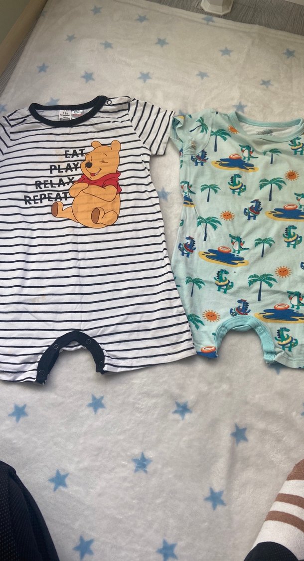 Pamuklu kumaştan yapılmış, renkli baskılı iki kısa kollu bebek tulumu. Biri çizgili ve PLAY, REPEAT, RELAX yazılı ayıcık baskılı, diğeri mavi tonlarda tropikal desenli. Kolay giydirme için çıtçıtlı.