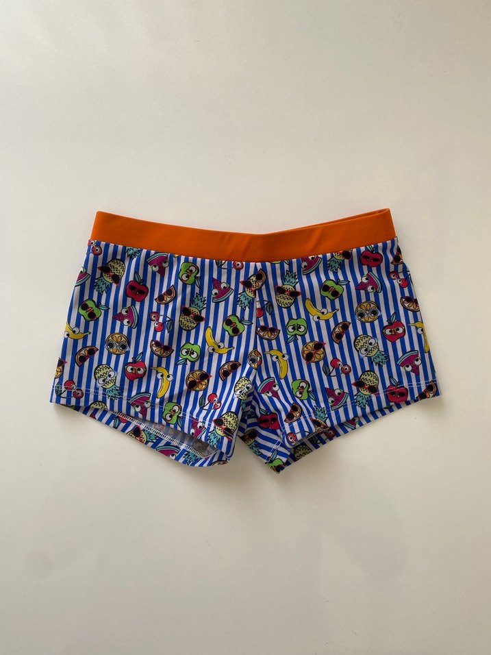 Turuncu bel bandı ve dikey çizgilerle renkli, çeşitli çizgi karakter desenlerine sahip erkek çocuk mayo.