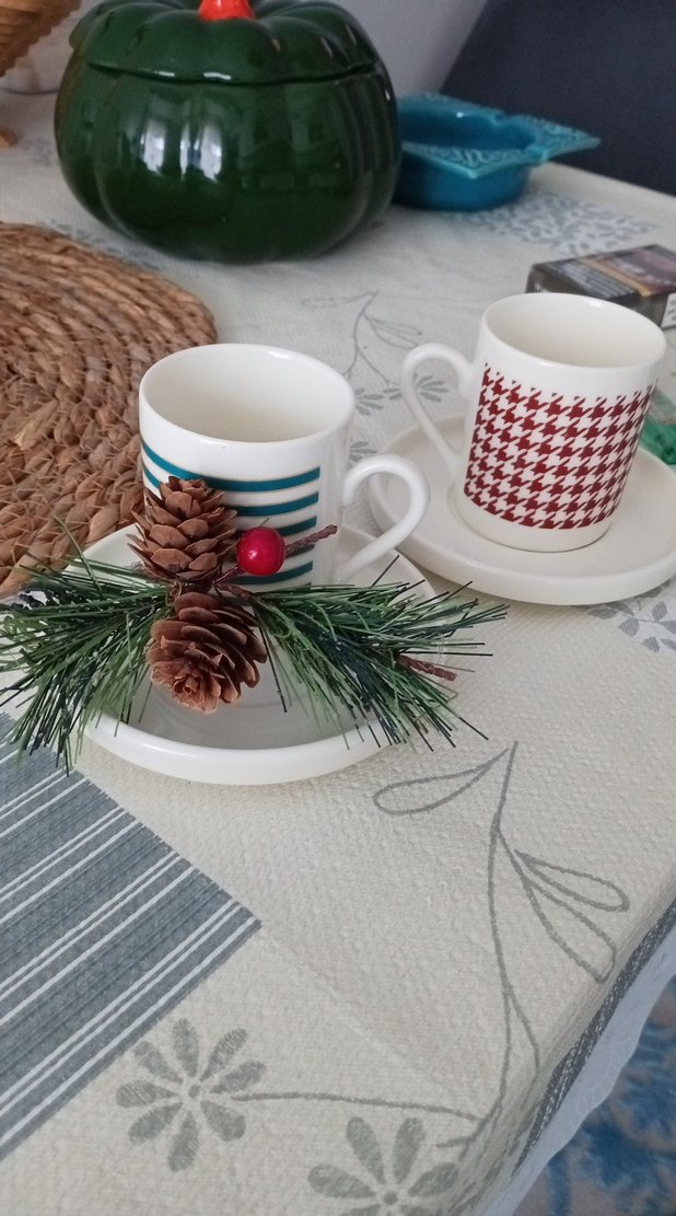Çizgili ve kareli desenlere sahip beyaz seramik fincanlar, her biri uyumlu tabağıyla birlikte sunulur. Sıcak içecekler için uygundur. ☕