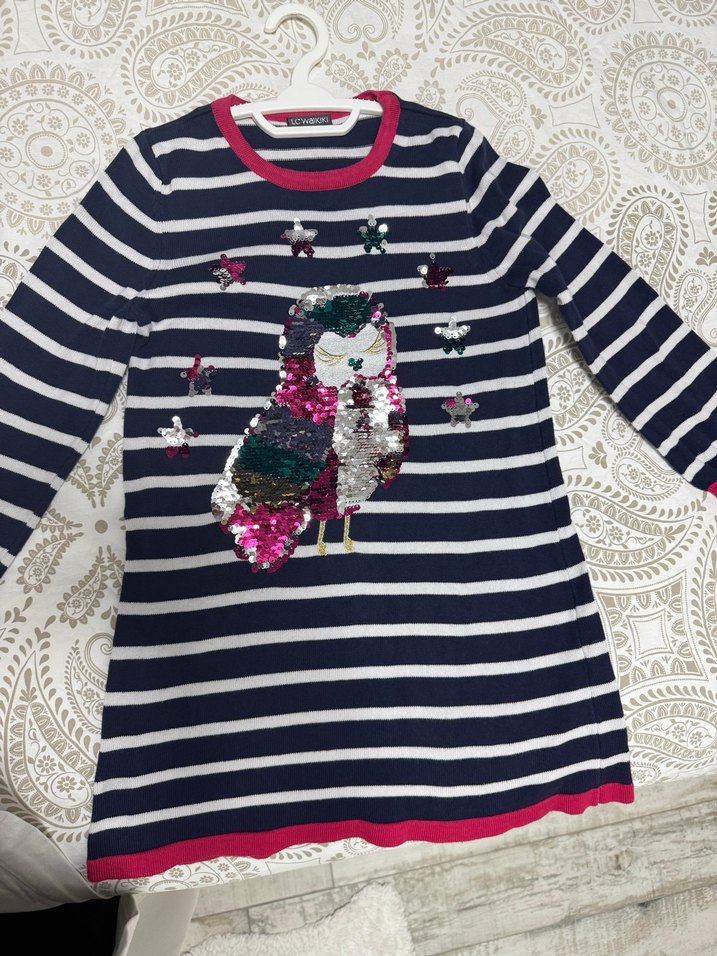 Uzun kollu, bisiklet yaka, çizgili ve payet işlemeli kuş desenli kız çocuk triko elbise, bohem tarzda ve renkli detaylara sahip.