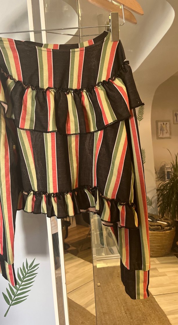 Çok renkli çizgili, bol kesim ve volan detaylı uzun hamile eteği, bohem ve retro tarzını yansıtır.