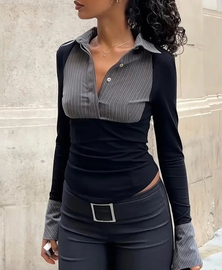 Çizgili Yakalı Gri Kadın gömlek